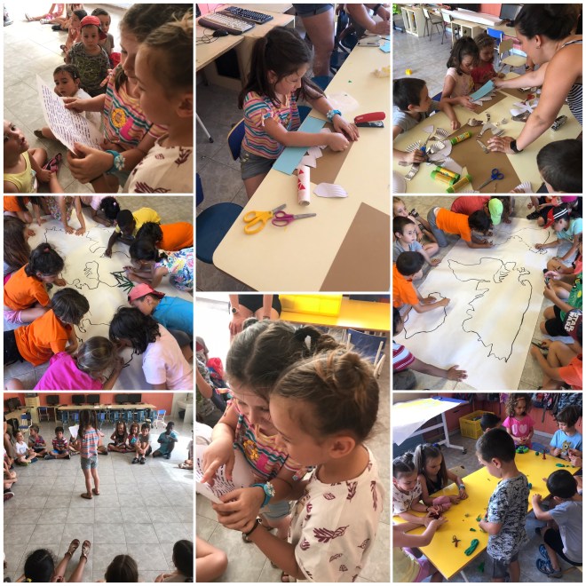 Dijous al matí vam fer jocs al pati, com mata-conills o el pi. Després hem esmorzat i jugat amb els menuts amb racons diversos. I… SORPRESA! Quan hem arribat del pati ens hem trobat una carta d’una exploradora que es diu Jane Fox, que vol descobrir el món i ens demana ajuda per poder-ho fer amb ella. A la taula, ens ha deixat també uns avions perquè els pintem i fem penjadors per deixar les nostres coses durant el casal. A més, ens ha donat una pista d’on estava i hem hagut de fer amb plats de cartó l’Òpera de Sidney, ens ha quedat bonic, som uns artistes! Per últim hem pintat dos mapes del món, creiem que són per marcar els països que visitarem, ja us explicarem quan la Jane ens ho digui.